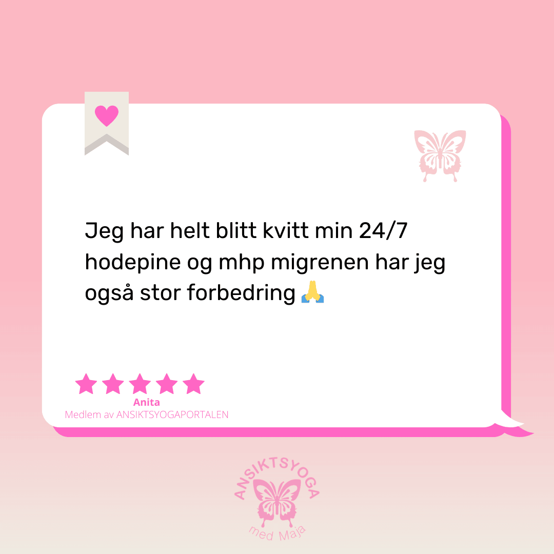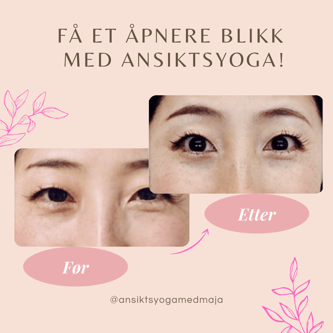 Ansiktsyoga er en ENKEL og GØY måte å prioritere deg selv på, det tar kun 5-15 minutter om dagen. Du har nemlig over 40 ulike muskler i ansiktet ditt, som du kan trene og stramme opp på samme måte som på resten av kroppen. Ikke minst er ansiktsyoga en helt NATURLIG måte å forebygge, jevne ut og bremse aldringstegnene dine på. Tenk at noe så GØY og ENKELT som ansiktsyoga kan hjelpe deg til å kunne si “Hei til en YNGRE og mer GLØDENDE deg!.